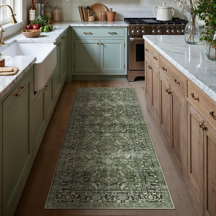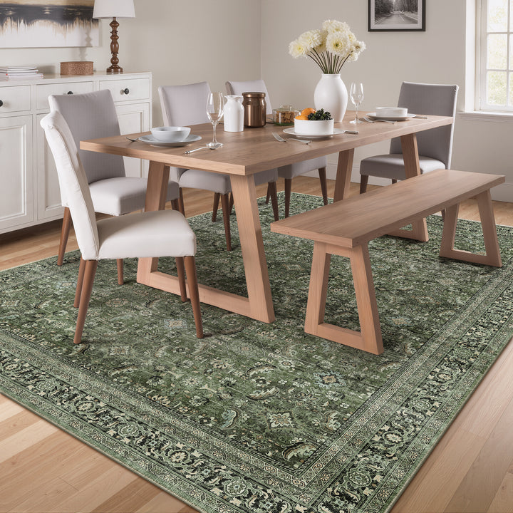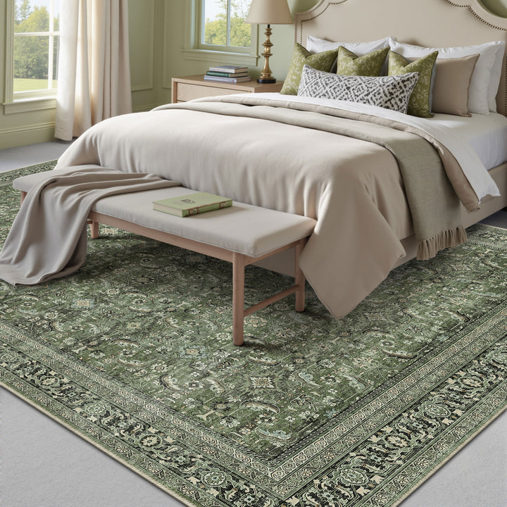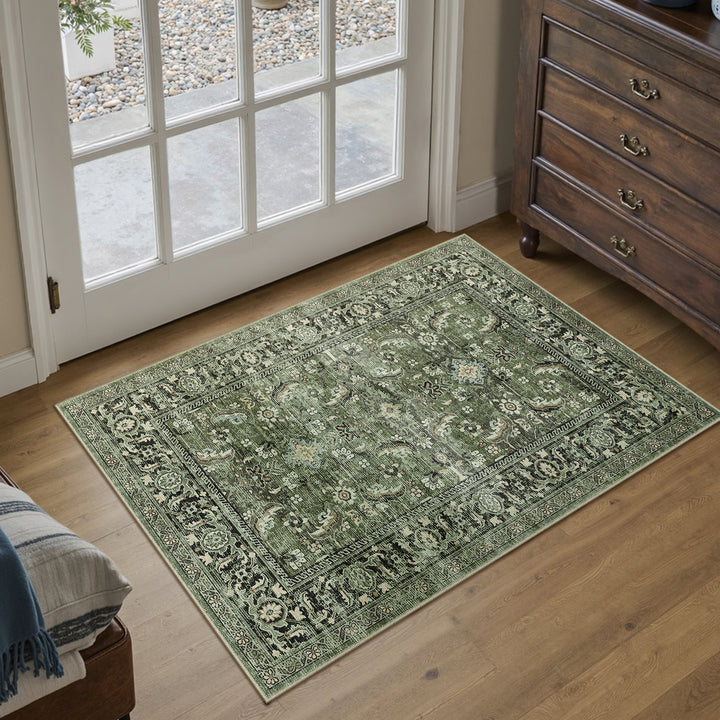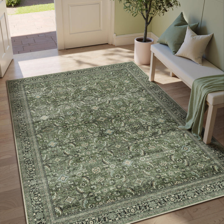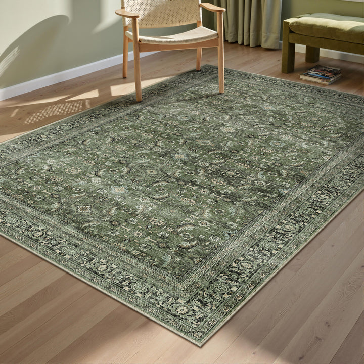 Amara Persian Vintage Green Short Pile Traditional Distressed Washable Rug